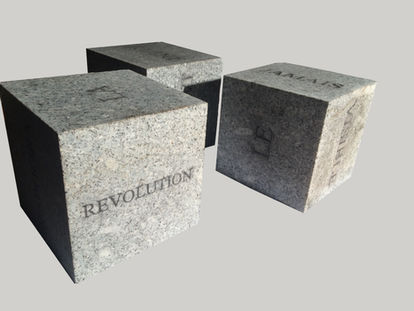 Series of granite cubes, each face engraved with words using laser etching. They can be handled by the viewer, who thereby generates as many lexical sequences as there are faces consulted.